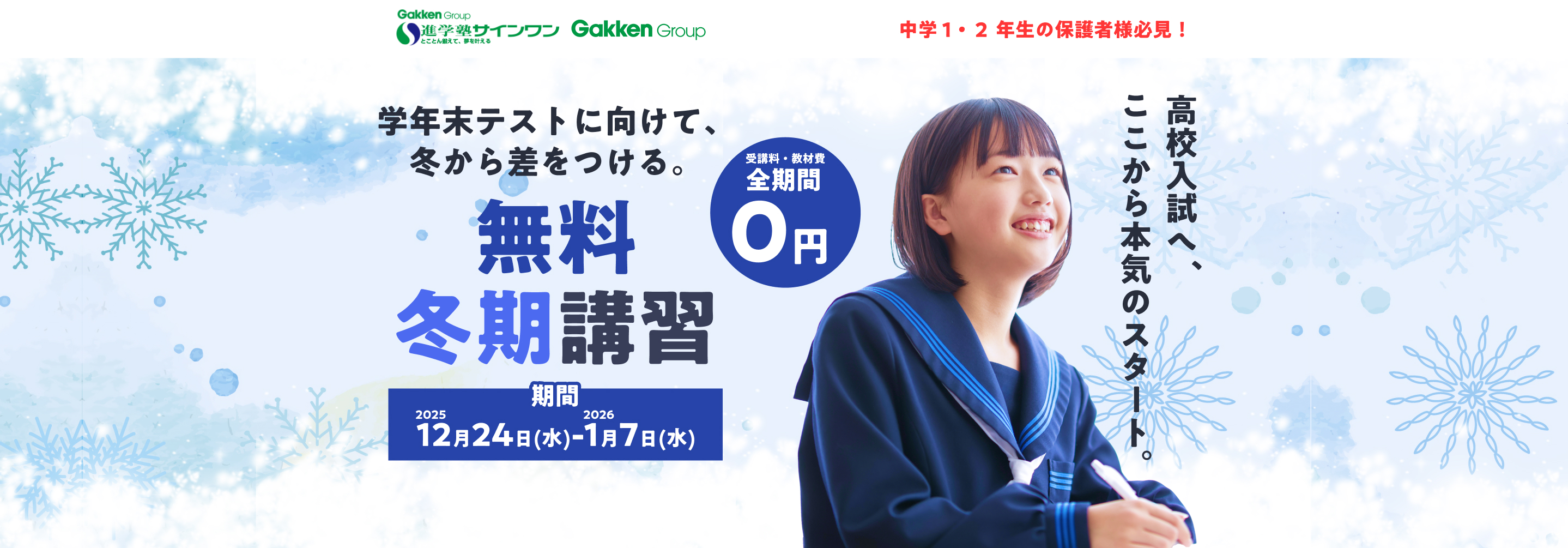 教科書内容の理解と定着を図り、定期テスト対策と将来の高校入試につながる学習を行います。冬期講習会でも基本を固め、3学期定期テストの目標達成へ。
