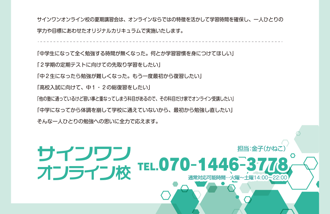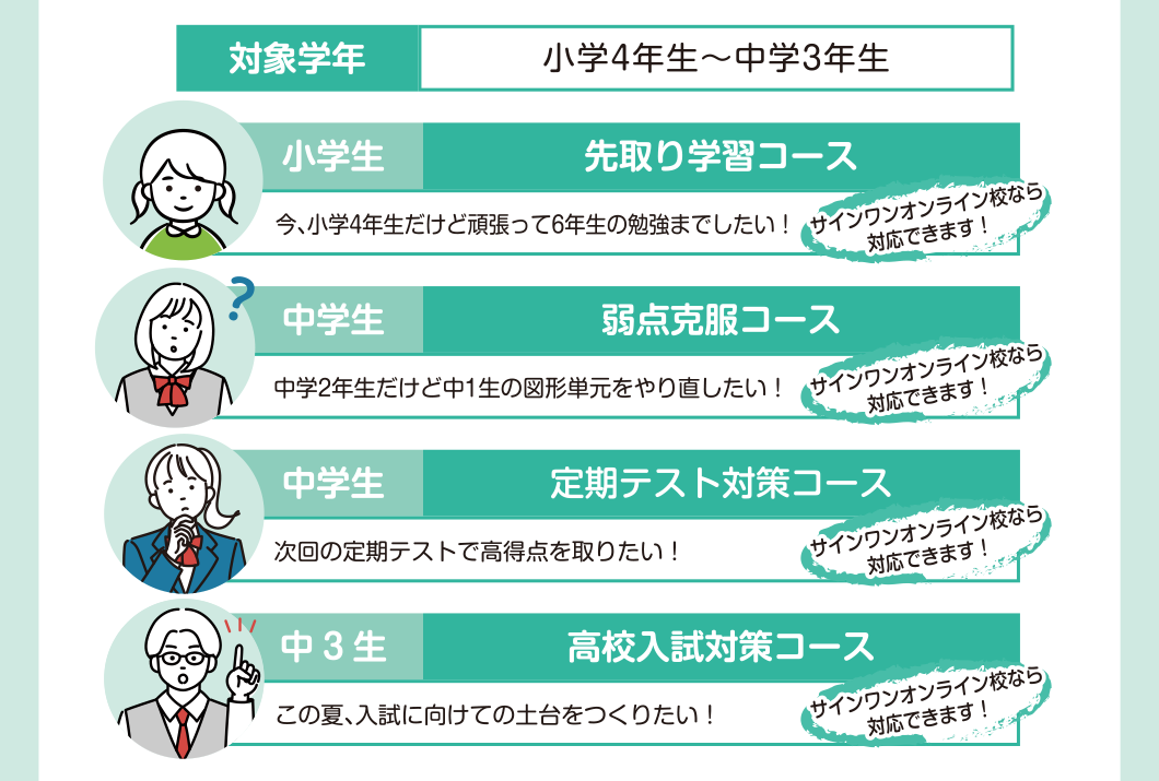 サインワンオンライン校の夏期講習会は、オンラインならではの特徴を活かして学習時間を確保し、一人ひとりの学力や目標にあわせたオリジナルカリキュラムで実施いたします。一人ひとりの勉強への思いに全力で応えます。