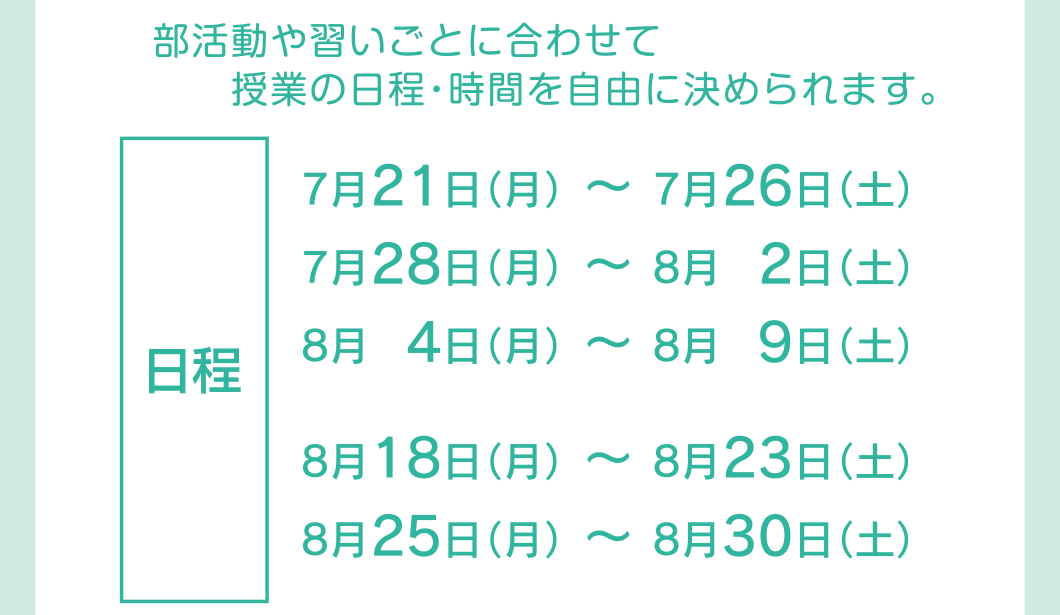 日程:7月21日(月)〜26日(土)、7月28日(月)〜8月2日(土)、8月4日(月)〜9日(土)、8月18日(月)〜23日(土)、8月25日(月)〜30日(土)