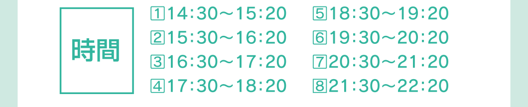 時間:①14:30〜15:20、②15:30〜16:20、③16:30〜17:20、④17:30〜18:20、⑤18:30〜19:20、⑥19:30〜20:20、⑦20:30〜21:20、⑧21:30〜22:20