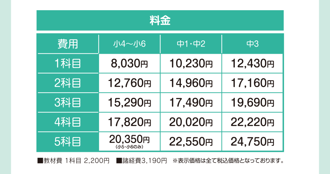 料金:小4~小6…1科目8,030円、2科目12,760円、3科目15,290円、4科目17,820円、5科目20,350円(小5・小6のみ)。中1・中2…1科目10,230円、2科目14,960円、3科目17,490円、4科目20,020円、5科目22,550円。中3…1科目12,430円、2科目17,160円、3科目19,690円、4科目22,220円、5科目24,750円。