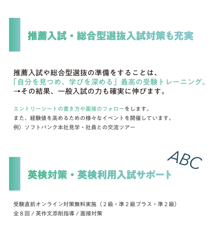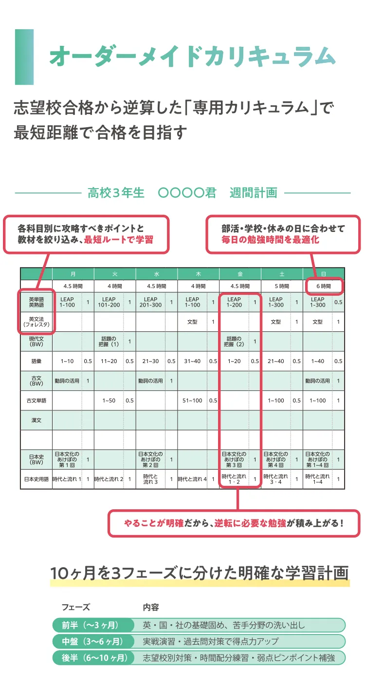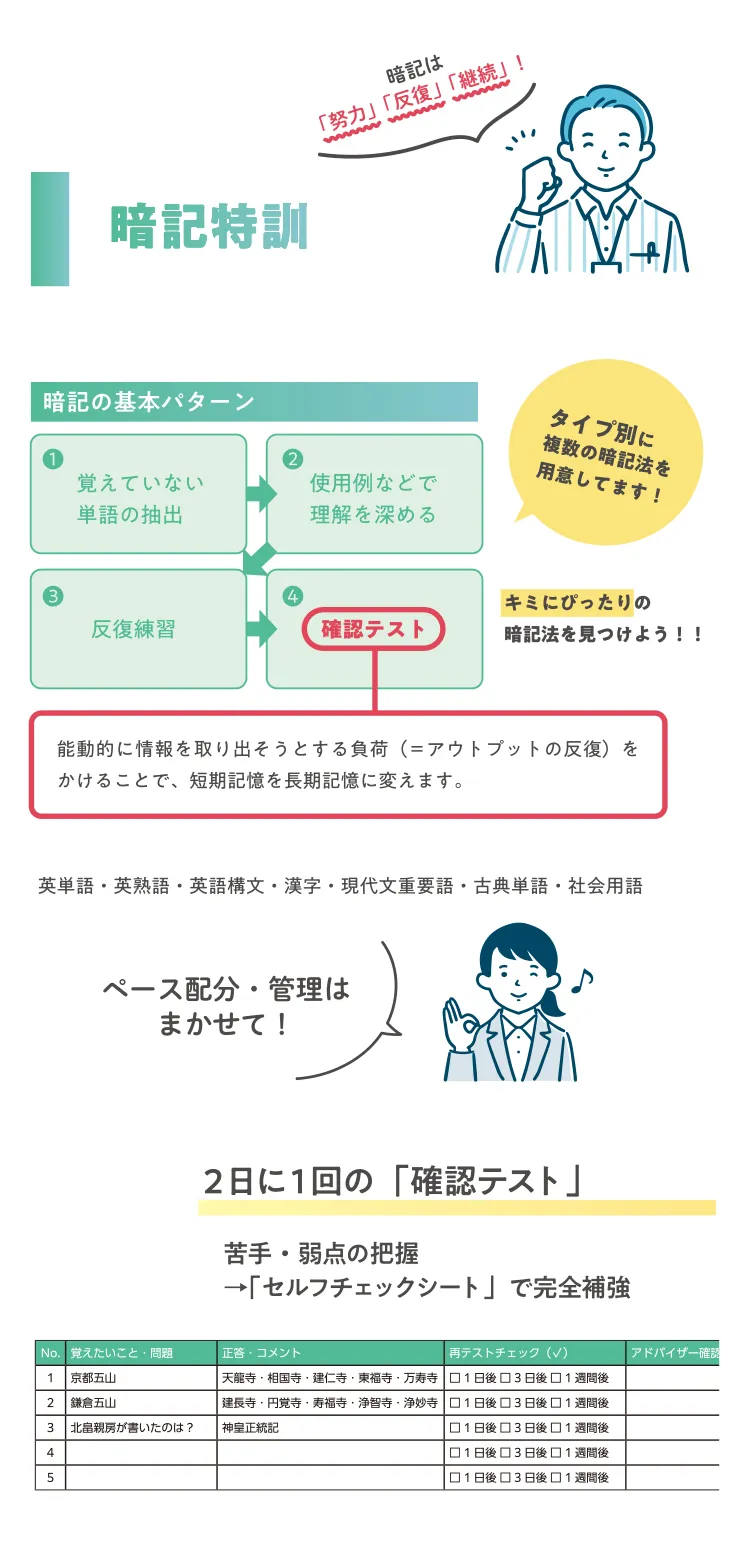 通常授業のカリキュラムを停止し、定期テストの範囲について詳しく学ぶ期間。通常授業とは異なり、学校のテストに直結する内容をピンポイントで学習できるため、効果的に成績を伸ばせます。