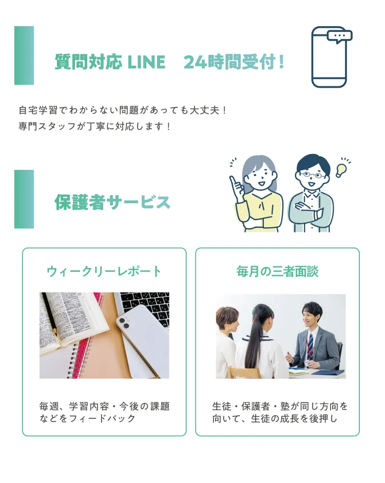 なお、進級面談や入学試験に向けた直前の面談につきましては、担当講師の状況により臨機応変にご対応いたしますので教室からのご連絡をお待ちください。