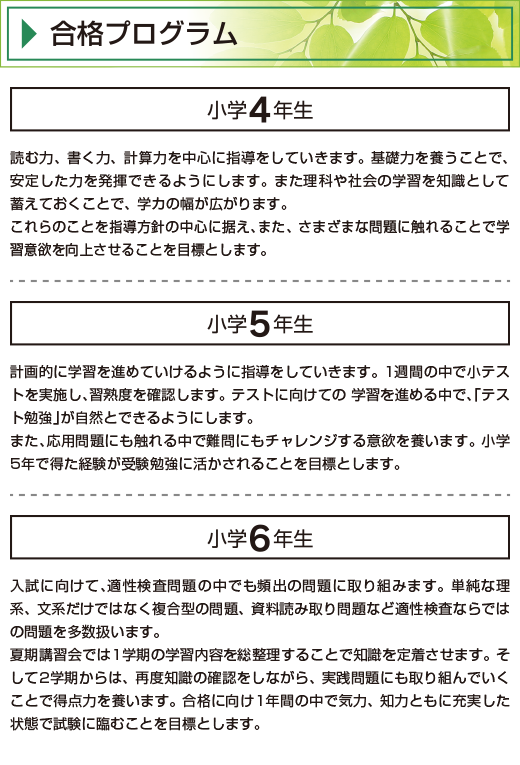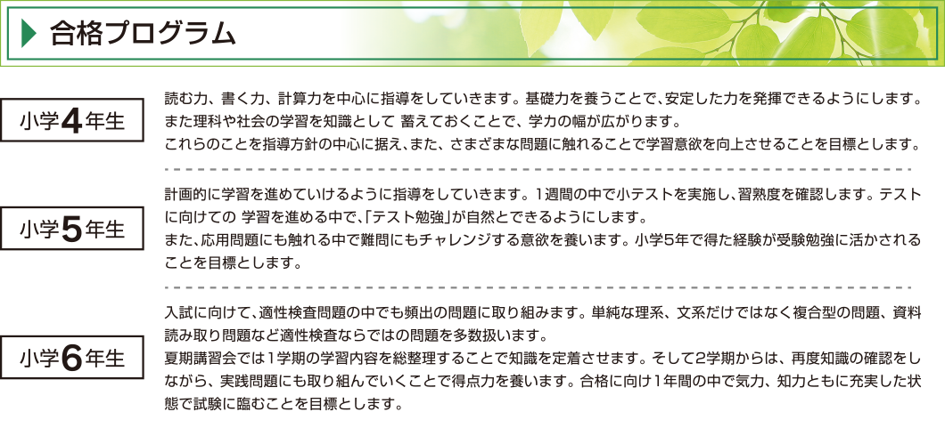 志望校に合格するために適性検査独特の問題を突破する学力を鍛えていきます。常に受験本番を意識し、日々研鑽していき志望校合格を目指します。