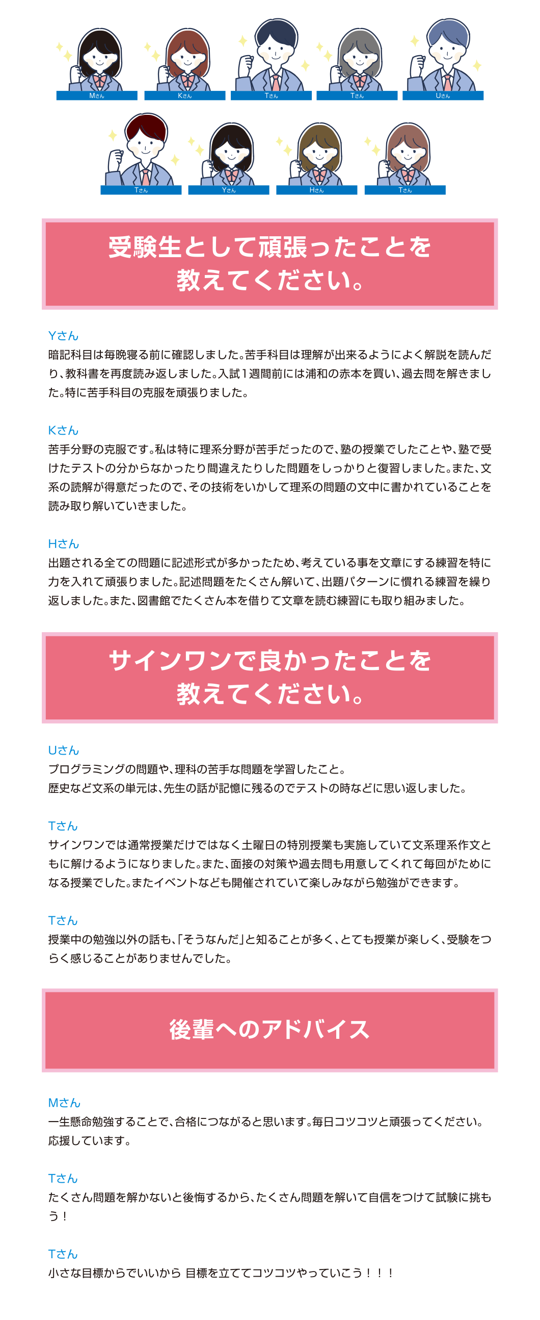 - 5年生までは他の塾にいたが、サインワンに来てみんなが競争心を持って、それでいて仲の良い楽しい雰囲気の和やかな空間で勉強できたことが何より良かった。夏休みなどには毎日テストがあって周りと競争ができたことが合格のきっかけになったと感じます。