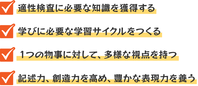 計算などの基礎を徹底的に鍛えていき、適性検査に必要な応用力を身につけます。初見の問題でも解答までたどりつくことのできる能力を養います。