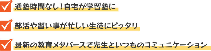 サインワンオンライン校に所属する生徒さんは、仮想空間の中でアバターを使うことで先生や他の生徒さんとのコミュニケーションが可能です。これによって、自宅にいながら実際の塾に通っているような感覚を持っていただけます。仮想空間の中でクラスメイトと仲良くするもよし、お気に入りの先生と授業前に雑談をするもよし、様々なコミュニケーションがとれます。また、オンラインでの学習ですので、保護者の方々の目の届く場所で勉強に取り組んで頂けるのも大きなメリットです。お子様がおうちで日々頑張って成長していく姿を、ぜひとも近くでご覧いただければ幸いです。