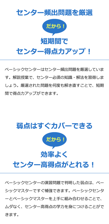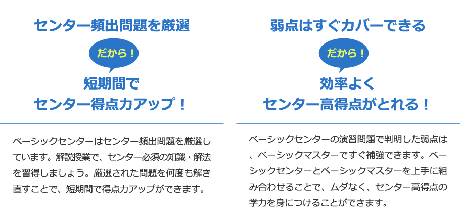 「センター実戦力強化」を目的とした、センター頻出問題の解説授業です。解法がマスターでき、「ベーシックマスター」で培った基礎力を、センター試験で高得点を取るための実戦力にまで高めることができます。