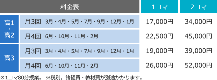 ニーズに応じて、1対1、1対2の指導形態が用意されています。指導を受ける科目は、自由に選択していただけます。苦手な1科目だけに集中して成績を伸ばしたり、受験に向けて5科目全てサポートすることも可能です。授業だけでなく英検対策、ハイレベル指導についても経験豊富な教師陣が最後までサポートします。