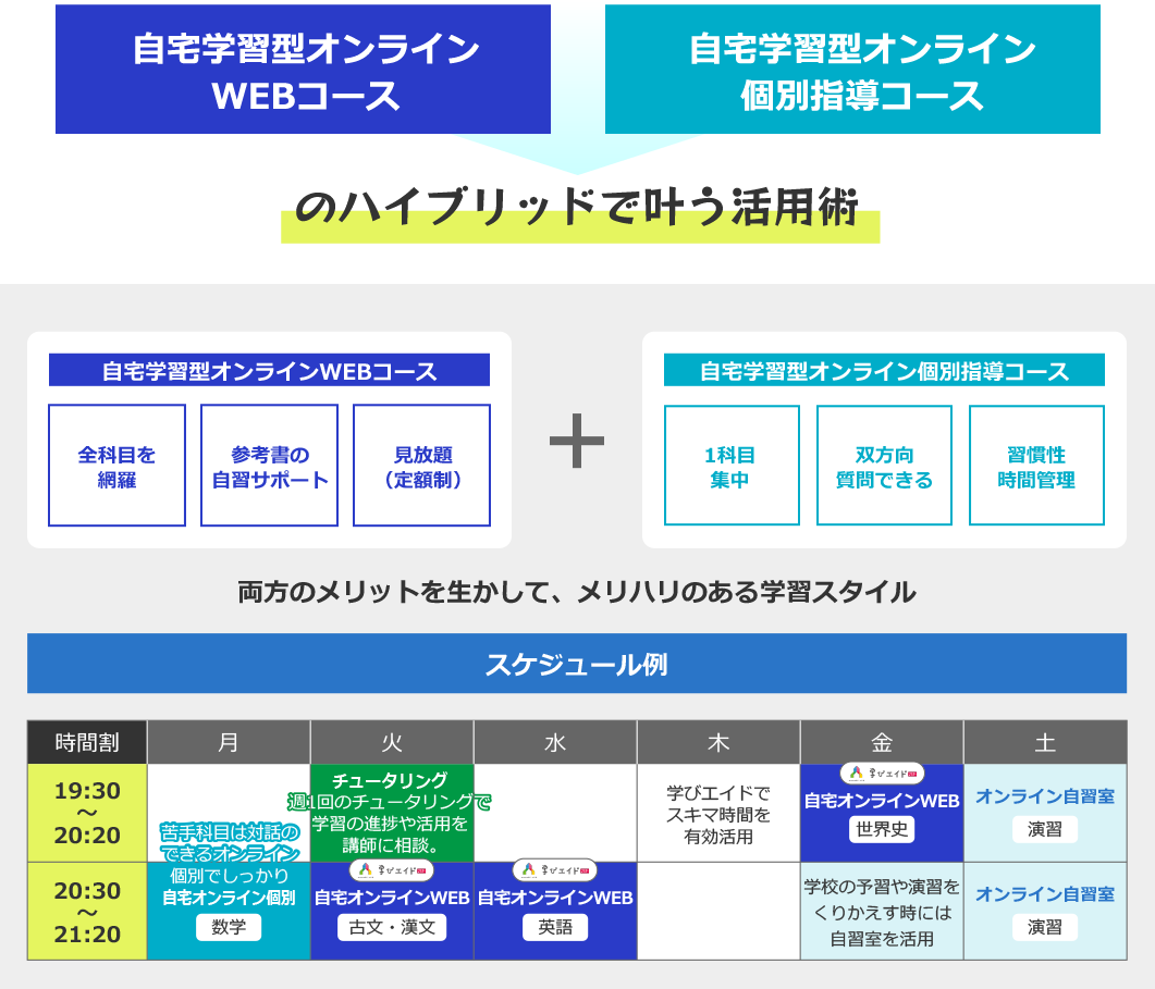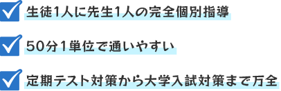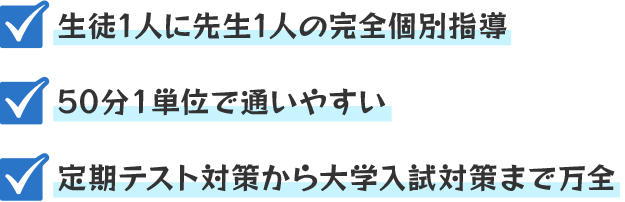 完全1対1の指導形態が用意されています。指導を受ける科目は、自由に選択していただけます。苦手な1科目だけに集中して成績を伸ばしたり、受験に向けて5科目全てサポートすることも可能です。授業だけでなく英検対策、ハイレベル指導についても経験豊富な講師陣が最後までサポートします。