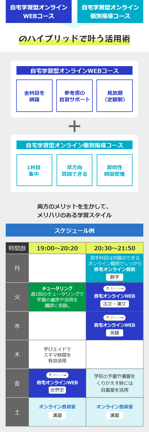 部活動やテスト期間などで、授業を受けられる日時が限定されると、どうしても設定された日時では、授業が受けることが出来ないケースが考えられます。その場合には、講師と日時を相談の上で、1コマ50分の授業のコマ組みを別日に振り替えすることが可能です。