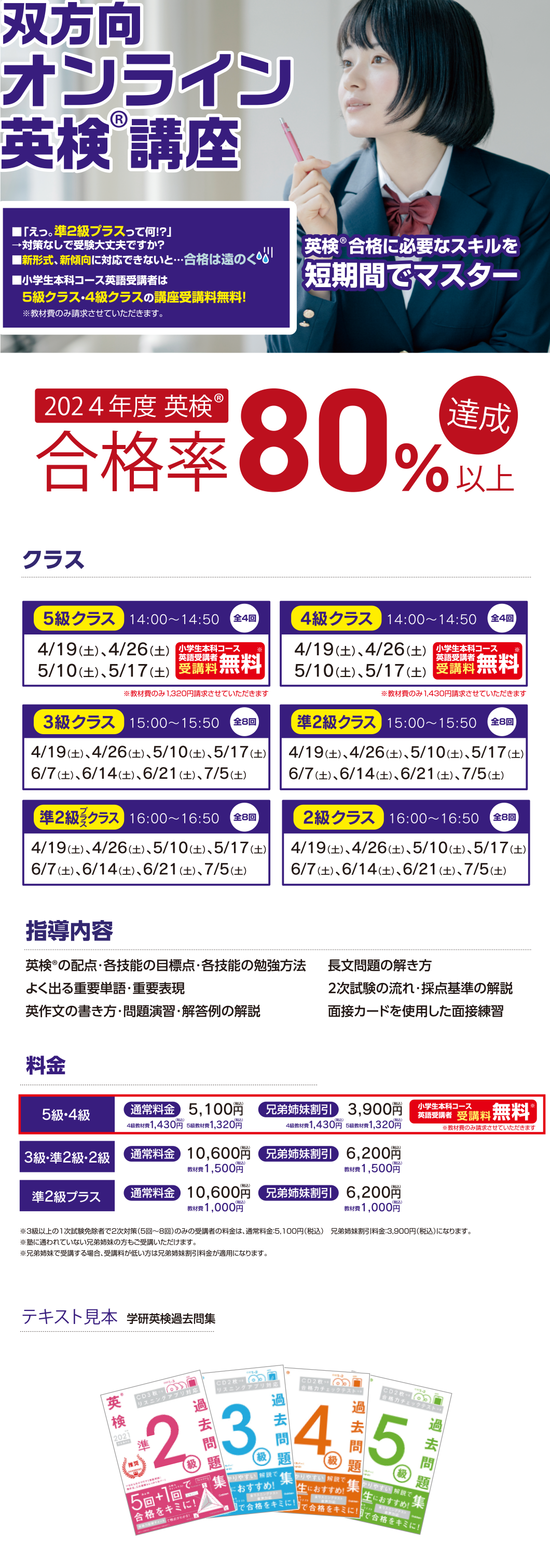 クラス:5級クラス、4級クラス、3級クラス、準2級クラス、準2級プラスクラス、2級クラス