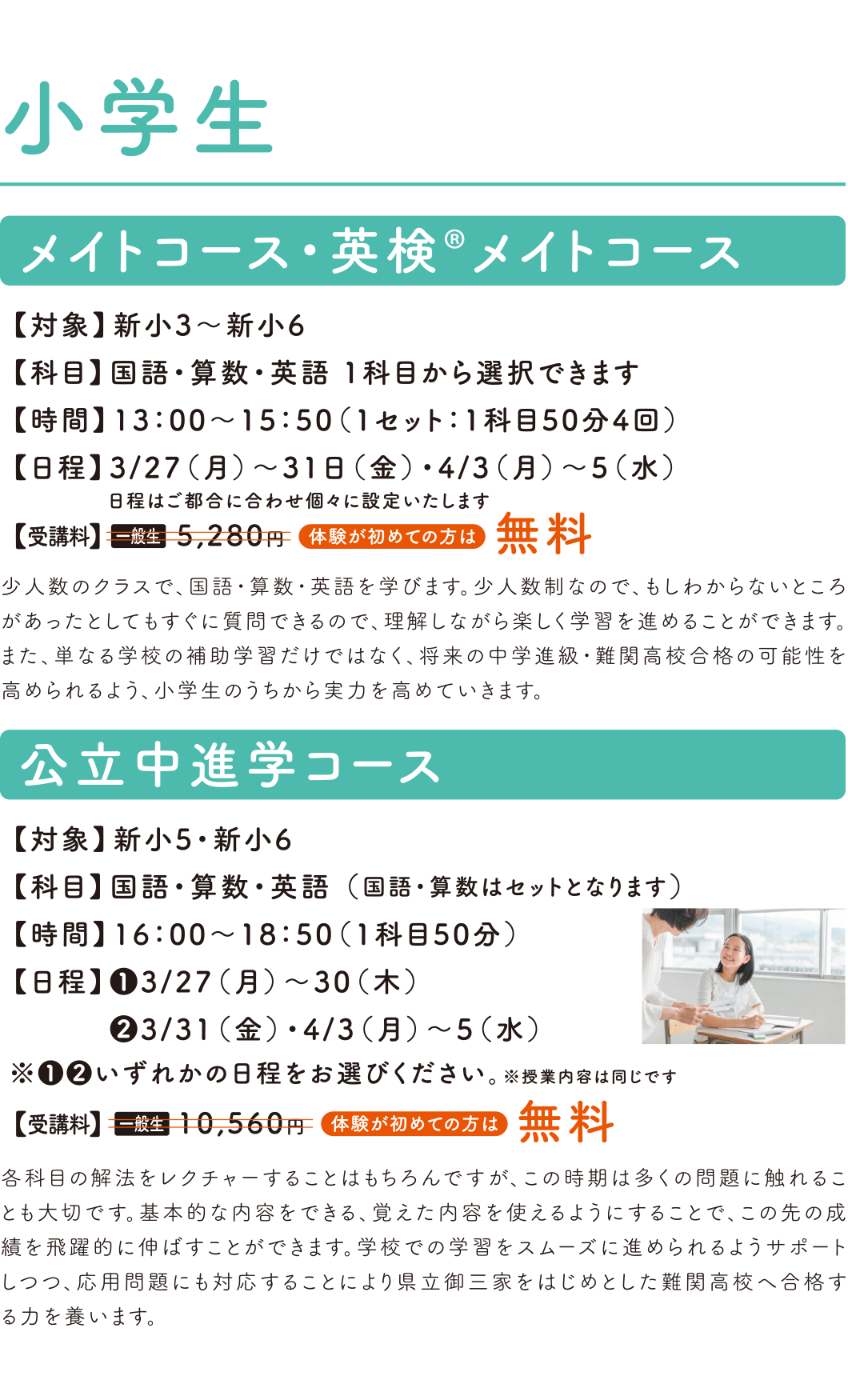 小学生 メイトコース・英検メイトコース【対象】新小3〜新小6【科目】国語・算数・英語 1科目から選択できます【時間】13:00〜15:50(1セット:1科目50分4回)【日程】3/27(月)〜31日(金)・4/3(月)〜5(水)日時はご都合に合わせ個々に設定いたします【受講料】体験が初めての方は無料 少人数のクラスで、国語・算数・英語を学びます。少人数制なので、もしわからないところがあったとしてもすぐに質問できるので、理解しながら楽しく学習を進めることができます。また、単なる学校の補助学習だけではなく、将来の中学進級・難関高校合格の可能性を高められるよう、小学生のうちから実力を高めていきます。公立中高一貫コース【対象】新小5・新小6【科目】国語・算数・英語(国語・算数はセットとなります)【時間】16:00〜18:50(1科目:50分)【日程】①3/27(月)〜30日(木)②3/31(金)・4/3(月)〜5(水)①②いずれかの日程をお選びください。※授業内容は同じです。受講料】体験が初めての方は無料 各科目の解法をレクチャーすることはもちろんですが、この時期は多くの問題に触れることも大切です。基本的な内容をできる、覚えた内容を使えるようにすることで、この先の成績を飛躍的に伸ばすことができます。学校での学習をスムーズに進められるようサポートしつつ、応用問題にも対応することにより県立御三家をはじめとした難関高校へ合格する力を養います。