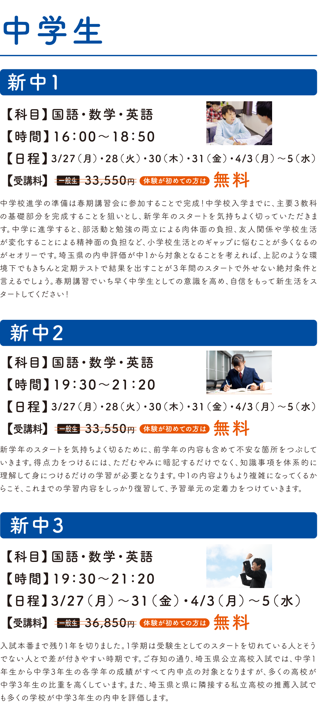 中学生 新中1 【科目】国語・数学・英語【時間】16:00〜18:50【日程】3/27(月)・28(火)・30(木)・31(金)・4/3(月)〜5(水)【受講料】体験が初めての方は無料 中学校進学の準備は春期講習会に参加することで完成!中学校入学までに、主要3教科の基礎部分を完成することを狙いとし、新学年のスタートを気持ちよく切っていただきます。中学に進学すると、部活動と勉強の両立による肉体面の負担、友人関係や学校生活が変化することによる精神面の負担など、小学校生活とのギャップに悩むことが多くなるのがセオリーです。埼玉県の内申評価が中1から対象となることを考えれば、上記のような環境下でもきちんと定期テストで結果を出すことが3年間のスタートで外せない絶対条件と言えるでしょう。春期講習でいち早く中学生としての意識を高め、自信をもって新生活をスタートしてください! 新中2 【科目】国語・数学・英語【時間】19:30〜21:20【日程】3/27(月)・28(火)・30(木)・31(金)・4/3(月)〜5(水)【受講料】体験が初めての方は無料 新学年のスタートを気持ちよく切るために、前学年の内容も含めて不安な箇所をつぶしていきます。得点力をつけるには、ただむやみに暗記するだけでなく、知識事項を体系的に理解して身につけるだけの学習が必要となります。中1の内容よりもより複雑になってくるからこそ、これまでの学習内容をしっかり復習して、予習単元の定着力をつけていきます。 新中3 【科目】国語・数学・英語【時間】19:30〜21:20【日程】3/27(月)〜31(金)・4/3(月)〜5(水)【受講料】体験が初めての方は無料 入試本番まで残り1年を切りました。1学期は受験生としてのスタートを切れている人とそうでない人とで差が付きやすい時期です。ご存知の通り,埼玉県公立高校入試では,中学1年生から中学3年生の各学年の成績がすべて内申点の対象となりますが,多くの高校が中学3年生の比重を高くしています。また,埼玉県と県に隣接する私立高校の推薦入試でも多くの学校が中学3年生の内申を評価します。