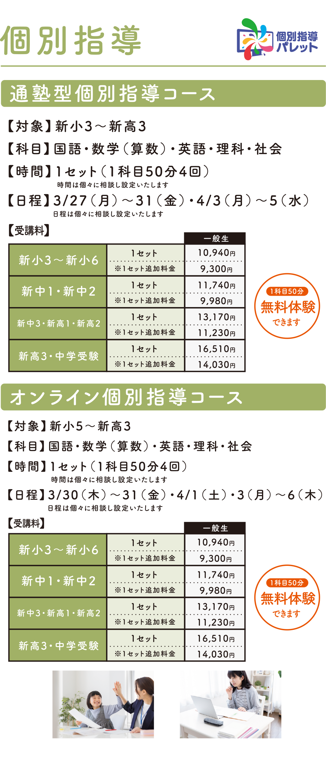 個別指導 通塾型個別指導コース 【対象】新小3〜新高3【科目】国語・数学(算数)・英語・理科・社会【時間】1セット(1科目50分4回)時間は個々に相談し設定いたします。【日程】3/27(月)〜31(金)・4/3(月)〜5(水)日程は個々に相談し設定いたします。【受講料 一般性】新小3〜新小6 1セット10,940円 ※1セット追加料金9,300円 新中1・新中2 1セット11,740円 ※1セット追加料金9,980円 新中3・新高1・新高2 1セット13,170円 ※1セット追加料金11,230円 新高3・中学受験 1セット16,510円 ※1セット追加料金14,030円 1科目50分無料体験できます オンライン個別指導コース 【対象】新小5〜新中3【科目】国語・数学(算数)・英語・理科・社会【時間】1セット(1科目50分4回)時間は個々に相談し設定いたします。【日程】3/30(木)〜31(金)・4/1(土)・3(月)〜6(木)日程は個々に相談し設定いたします。【受講料】新小3〜新小6 1セット10,940円 ※1セット追加料金9,300円 新中1・新中2 1セット11,740円 ※1セット追加料金9,980円 新中3・新高1・新高2 1セット13,170円 ※1セット追加料金11,230円 新高3・中学受験 1セット16,510円 ※1セット追加料金14,030円 1科目50分無料体験できます