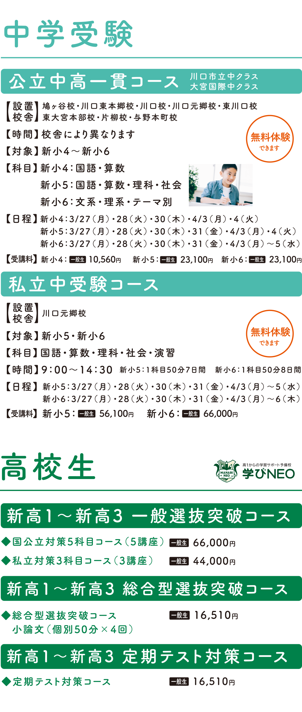 中学受験 公立中高一貫コース 川口市立中クラス・大宮国際中クラス 【設置校舎】鳩ヶ谷校・川口東本郷校・川口校・川口元郷校・東川口校・東大宮本部校・片柳校・与野本町校【時間】校舎により異なります【対象】新小4〜新小6【科目】新小4:国語・算数 新小5:国語・算数・理科・社会 新小6:文系・理系・テーマ別【日程】新小4:3/27(月)・28(火)・30(木)・4/3(月)・4(火) 新小5:3/27(月)・28(火)・30(木)・31(金)・4/3(月)・4(火) 新小6:3/27(月)・28(火)・30(木)・31(金)・4/3(月)〜5(水)【受講料】新小4一般生:10,560円 新小5一般生:23,100円 新小6一般生:23,100円 無料体験できます 私立中受験コース【設置校舎】川口元郷校【対象】新小5・新小6【科目】国語・算数・理科・社会・演習【時間】9:00〜14:30【日程】新小5:3/27(月)・28(火)・30(木)・31(金)・4/3(月)〜5(水)新小6:3/27(月)・28(火)・30(木)・31(金)・4/3(月)〜6(木)【受講料】新小5一般生:56,100円 新小6一般生:66,000円 高校生 学びNEO 新高1〜新高3 一般選抜突破コース ◆国公立対策5科目コース(5講座)一般生 66,000円 ◆私立対策3科目コース(3講座)一般生 44,000円 新高1〜新高3 総合型選抜突破コース ◆総合型選抜突破コース 小論文(個別50分×4回)一般生 16,510円 新高1〜新高3 定期テスト対策コース ◆定期テスト対策コース 一般生 16,510円